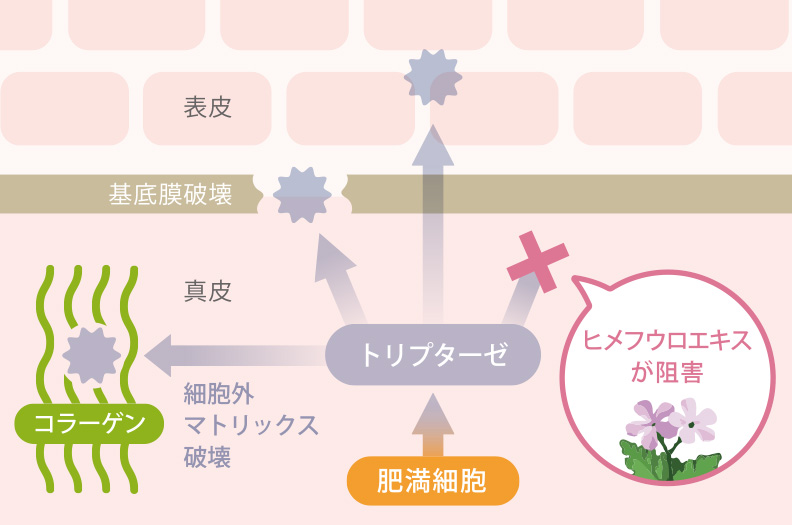 メラニン生成の抑制・色素沈着改善・角質メラニンの減少といった透明感のある肌づくりへのサポートが期待されるヒメフウロエキス(通称:プリンセスケア)。中でもヒメフウロエキスの特長的な作用だとされるのは、皮膚の表皮と真皮の間にある基底膜を紫外線から守ることだと言われており、皮膚年齢を若く保つサポート成分として注目されています。